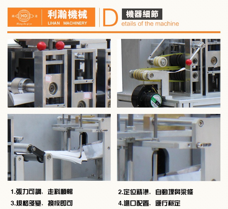 “鴻達”牌3M9012C口罩機,本機自動化程度高, 經過程序控制,可做到口罩壓紋、上鋁條、穿孔、半數、切邊一次成型,特別的制造工藝保證紋理清析、在出產時口罩不變形,不損原資料且可大極限的削減資料糟蹋,有用的保證了出產出的口罩質量