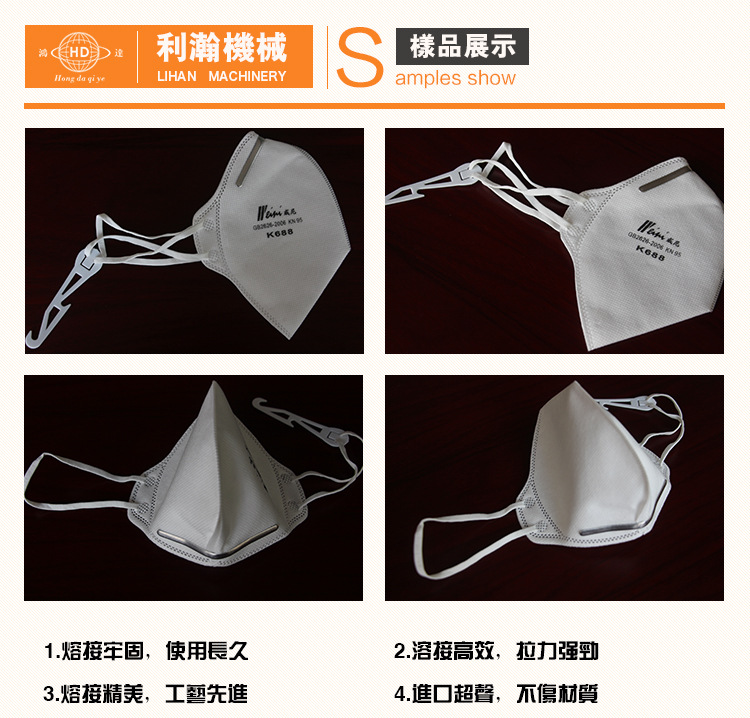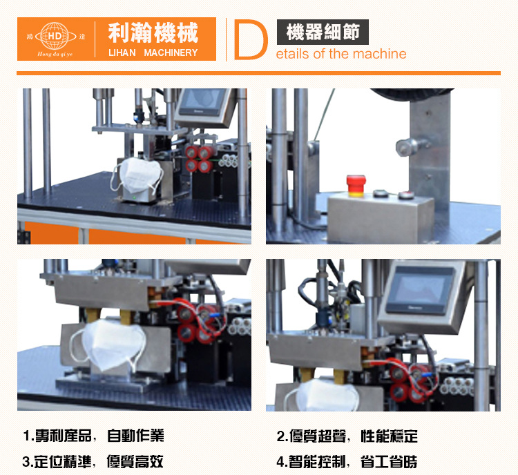 “鴻達”牌口罩外置鼻線熔接機是利瀚專為口罩貼鋁條而規(guī)劃的新產(chǎn)品,該設備是使用程序控制完結(jié)主動化出產(chǎn),從鼻線進入、主動剪切、恒溫熱壓貼 條均為主動化作業(yè)。制品外觀精巧,貼條結(jié)實,產(chǎn)能高效。